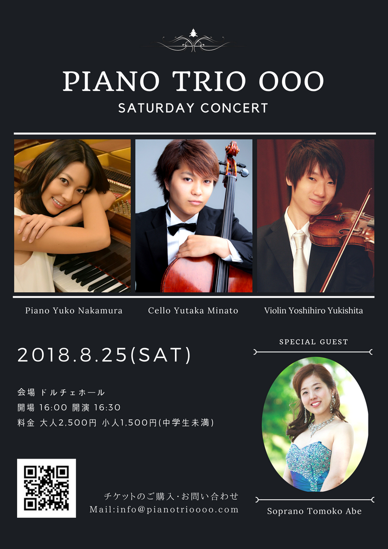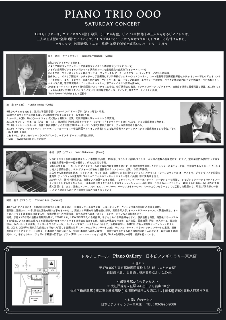 『 OOO 』トリオーは、ヴァイオリン =雪下 敬洋、チェロ =湊 豊、ピアノ =中村 悠子の三人からなるピアノトリオ。